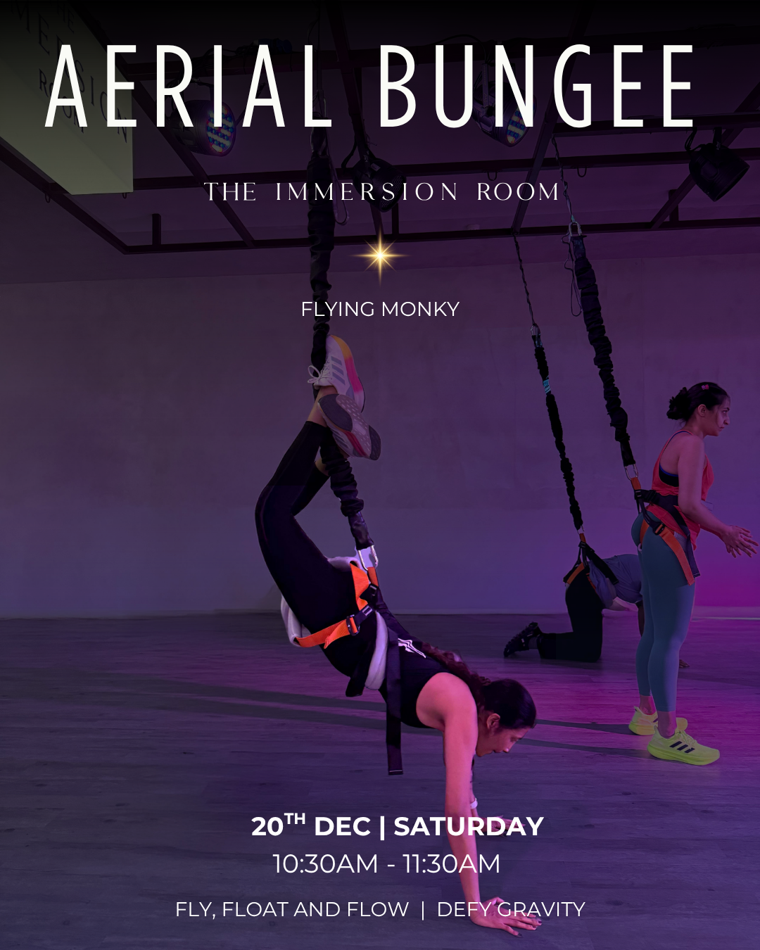 Saturday, 20th December 2025 | 10:30 AM – 11:30 AM at The Immersion Room, Gurugram—a high-energy aerial bungee experience that blends strength, cardio, and playful flight for a workout that feels powerful, freeing, and unlike anything else.