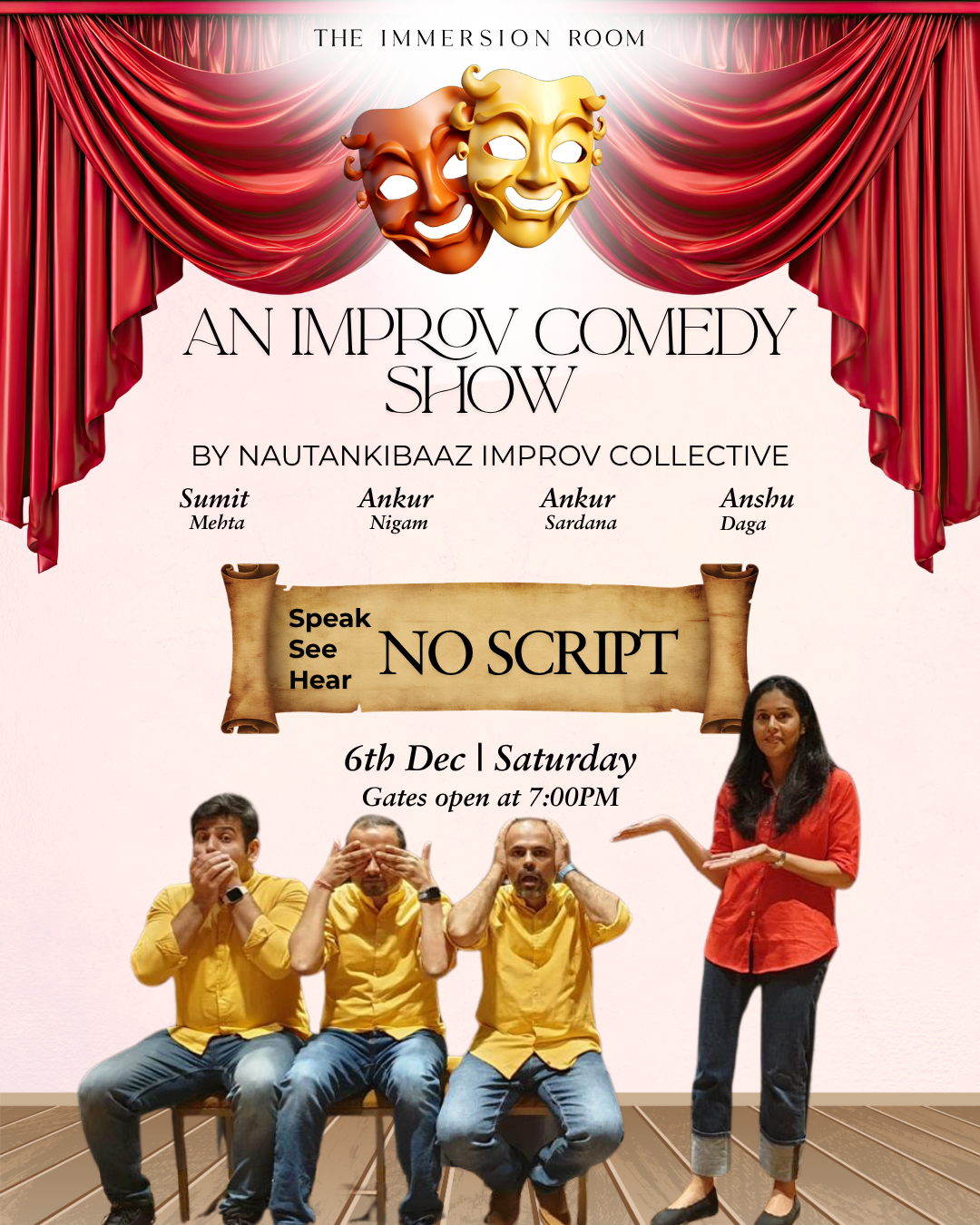 Happening Saturday, December 6th, 2025 | Gates open at 7 PM—The Immersion Room, Gurugram—step into a night of wild, unscripted comedy as Nautankibaaz Improv Collective spins your ideas into pure, unpredictable magic.